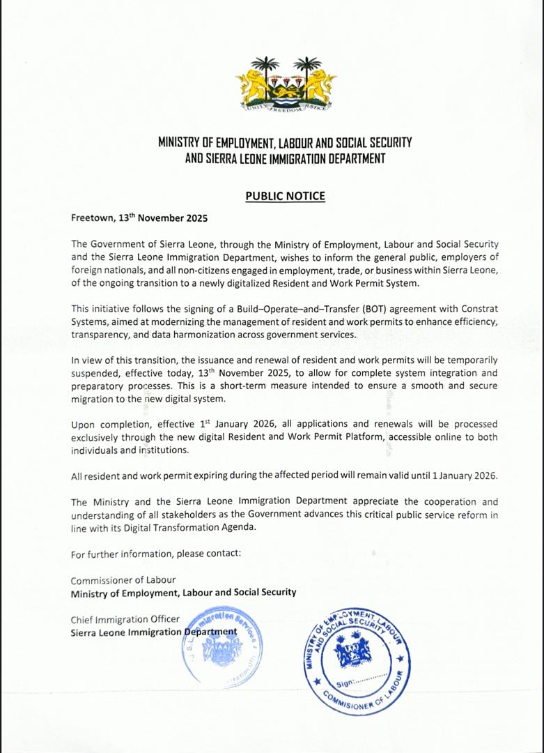 Sierra Leone İstihdam, Çalışma ve Sosyal Güvenlik Bakanlığı tarafından 13 Kasım 2025 tarihinde yapılan Kamuoyu Duyurusunda, kamu hizmetleri genelinde verimliliği, şeffaflığı ve veri uyumunu arttırmak amacıyla oturma ve çalışma izinleri yönetim sistemini modernize etmeyi amaçlayan yeni elektronik “Oturma ve Çalışma İzni Sistemi”ne yönelik sürdürülen dijital entegrasyon çalışmaları kapsamında;