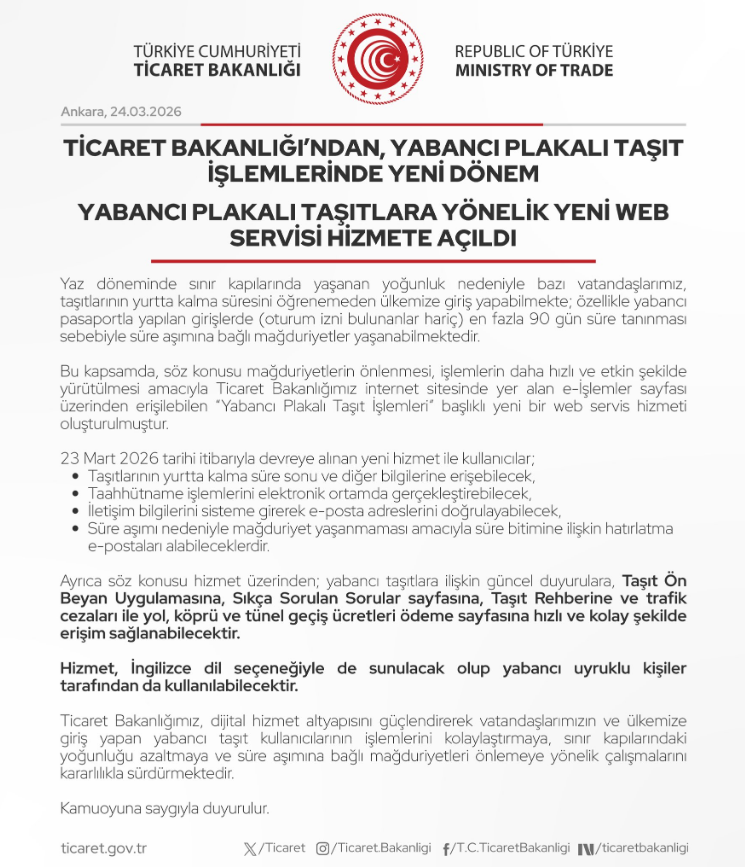Bu çerçevede, belirtilen hususlar dikkate alınarak Ticaret Bakanlığımızın internet sitesinde yer alan “E-HİZMETLER > e-işlemler” sayfasından erişilebilen “Yabancı Plakalı Taşıt İşlemleri” başlıklı yeni bir web servis hizmeti (Erişim linki: https://ypti.ticaret.gov.tr) oluşturulmuş olup, sözkonusu hizmet 23.03.2026 tarihi itibarıyla devreye alınmıştır.